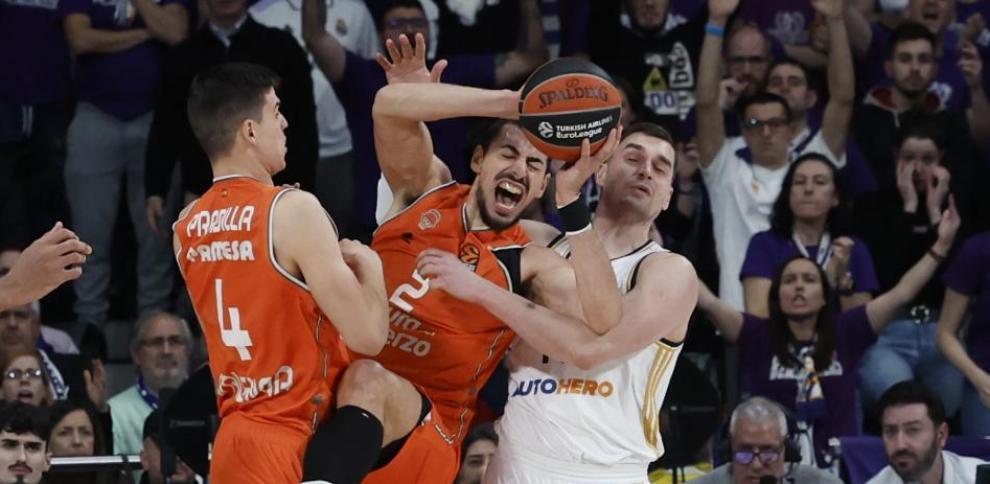 En frente, un Valencia Basket muy competitivo que obligó al Madrid a sudar la gota gorda para mantener la victoria en casa. Empezaron muy fuerte sometiendo al Madrid que fue a contracorriente todo el partido. Mantuvieron un nivel defensivo muy alto y hacían a los blancos consumir posesiones una tras otra. Fue tras genialidades de Llull y el Facu dónde se igualó la cosa y tocó volver a intentar controlar el partido. Llegaron a la prórroga agotados tras el esfuerzo físico en los 40 minutos reglamentarios y se acabó notando. Brandon Davies hizo un partido impresionante con 3/7 en triples y 19 puntos. Aguantó los arreones del Madrid y puso la calma para que no se descontrolase el partido aunque acabó expulsado por faltas en la prórroga. Le acompañó Chris Jones con 17 puntos y 6 asistencias anotando 3 triples. Harper, aunque fue el héroe que llevó el partido a la prórroga, solo anotó ese lanzamiento desde la línea de 3 puntos de los 8 que intentó y acabó con 8 puntos. Tras esta derrota, el Valencia sale de los puestos de Play-In que la semana que viene se enfrenta al EA Milán que están justo debajo de ellos y en dos semanas a Baskonia que es el equipo que tiene justo encima en la clasificación. Estas dos jornadas serán clave si el equipo del mediterráneo quiere tener oportunidades de jugar los playoffs.