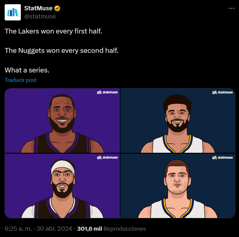 Se repetían las finales de conferencia del año pasado en una situación parecida a la que tenían en su momento. Los Lakers han escalado puestos y parecen un mucho mejor equipo del que demuestra su clasificación y en frente, un equipazo como la copa de un pino, con ahora mismo el mejor jugador del mundo y un quinteto completísimo al que hay que añadirle un pequeño detalle: ya son campeones de la NBA. Ya saben lo que es ganar, y suele ser muy importante haber ganado para volver a hacerlo. La serie abierta por todos los frentes: el duelo Jokic – Davis, el control del partido por parte de Jamal Murray, como responde Ham a los ataques de Denver, y con qué vuelve a sorprendernos LeBron James. Con 39 años, su equipo necesita que sea el mejor si quiere tener algo que hacer contra el actual campeón. Juanma Rubio, periodista del diario AS y fanático de los Lakers, dijo que una de las claves tenía que ser que Davis y LeBron fuesen el segundo y tercer mejor jugador de la serie, sin importar quien fuese quien, pero que estuviesen entre Jokic y Murray en cuanto a nivel, lo cuál me parece un análisis formidable. Y, aunque muchas noches ha sido así, no ha sido suficiente. La igualdad ha sido máxima y por detalles (que casi siempre caían de un solo lado) los Nuggets han ganado la serie 4-1.
