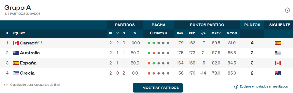 Aunque la posibilidad de no quedar terceros existe, la verdad es que viendo la situación de los otros grupos, a España con tener un partido igualado contra Canadá debería darle para pasar de grupos. Japón y Brasil en el grupo B se enfrentarán en la última jornada y ambos equipos tienen 0 victorias y un +- de -25. Del grupo C ya hemos hablado, pero me sorprendería que una selección tan competitiva como Serbia con una estrella tan competitiva como Jokic esté haciendo cábalas para evitar a EEUU y no salga a ganar como buena selección balcánica que es.
