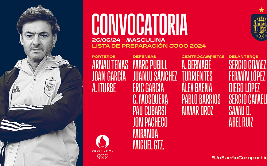 Santi Denia, seleccionador de España de cara a estos Juegos Olímpicos de París 2024, ha dado a conocer esta mañana los 22 jugadores preconvocados con el combinado español para esta cita. De estos 22, el manchego tendrá que dejar a cuatro futbolistas descartados, como reservas. Lamine Yamal y Nico Williams, actualmente jugando en Alemania la Eurocopa, no están preconvocados para los Juegos Olímpicos, por lo … Continúa leyendo Prelista de Santi Denia para los Juegos Olímpicos: Fermín y Baena harán doblete.